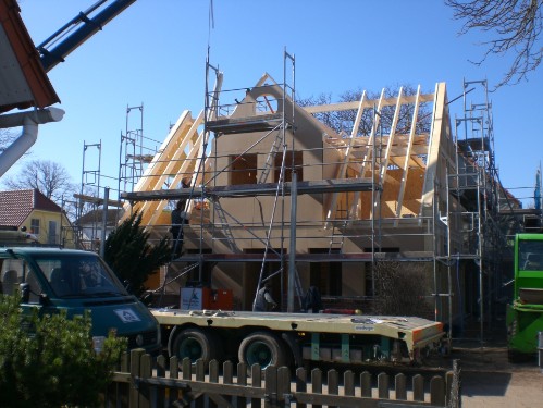 Die vorgefertigten Wandelemente des Erdgeschosses werden montiert